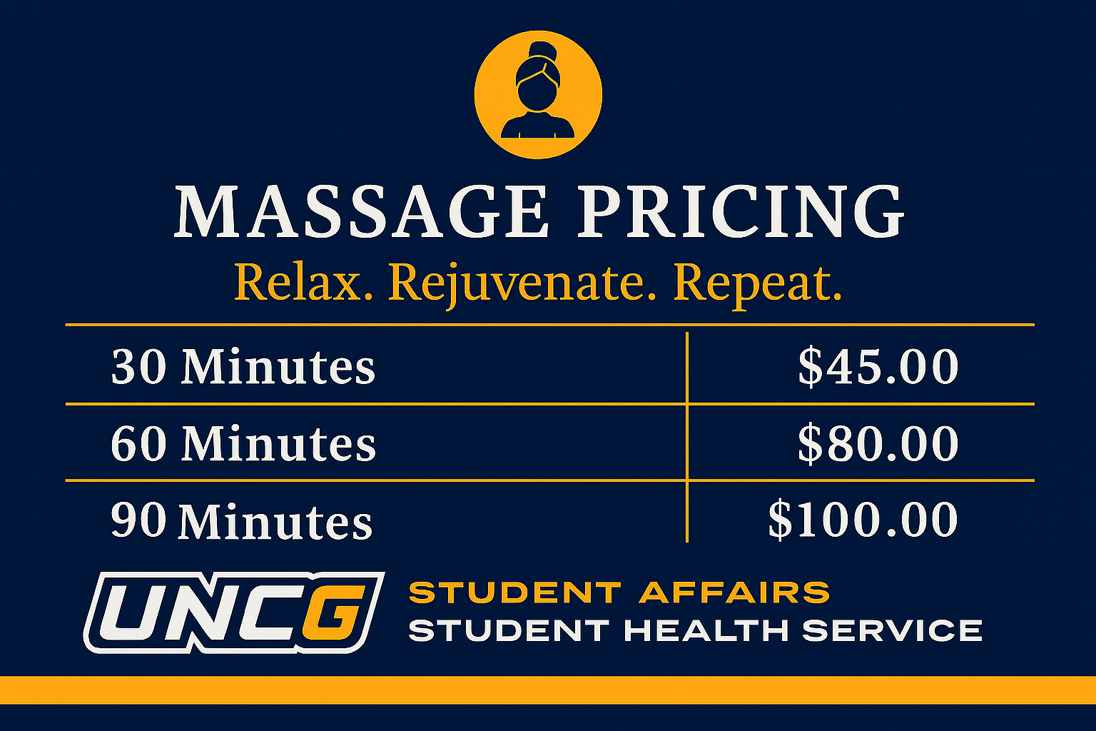 Appointments are required. Please check in at the front desk on the main floor with your student ID. Charges apply for no-shows or cancellations made less than 24 hours in advance. If you’ve been exposed to illness or have flu-like symptoms, please reschedule.