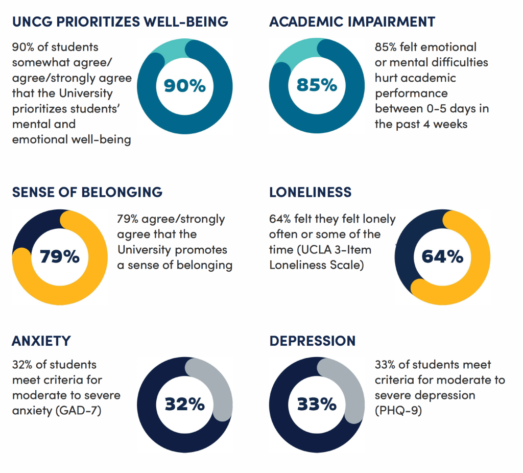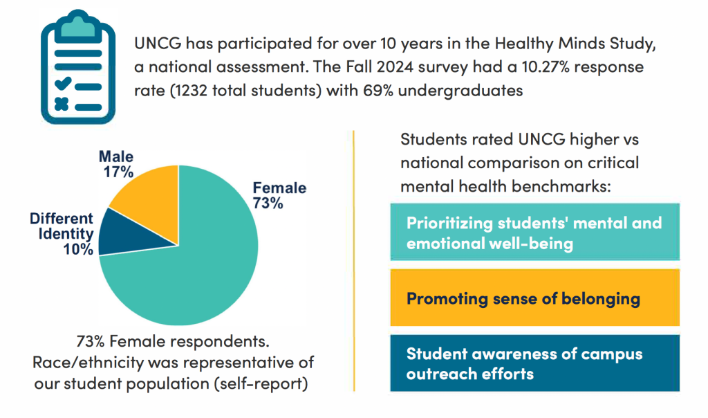 Over 850,000 responses from students at more than 600 colleges and universities have been gathered. UNCG has administered the HMS in 2012, 2016, and 2022. As part of becoming a JED Campus, the HMS will be administered again during the 2024-2025 academic year.